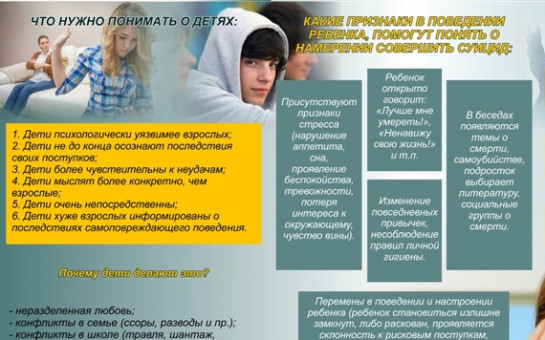 Если вы заметили у ребенка суицидальные наклонности, постарайтесь поговорить с ним по душам. Только не задавайте вопроса о суициде внезапно, если человек сам не затрагивает эту тему. Попытайтесь выяснить, что его волнует, не чувствует ли он себя одиноким, несчастным, загнанным в ловушку, никому не нужным или должником, кто его друзья и чем он увлечен. Можно попытаться найти выход из сложившейся ситуации, но чаще всего ребенку достаточно просто выговориться, снять накопившееся напряжение, и его готовность к суициду снижается. Всегда следует уяснить «Какая причина» и «Какова цель» совершаемого ребенком действия. Не бойтесь обращаться к специалистам-психологам, психотерапевтам, психиатрам.